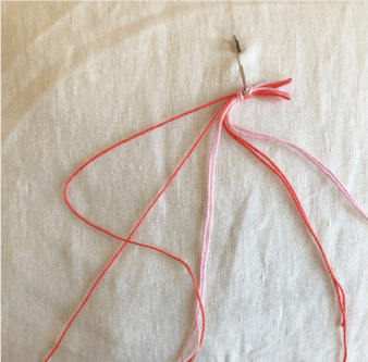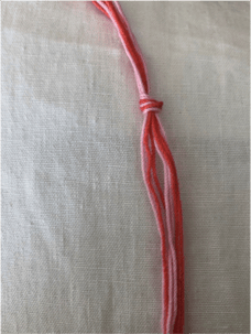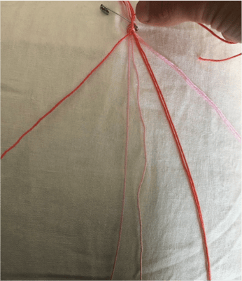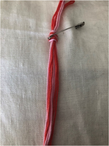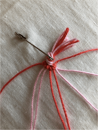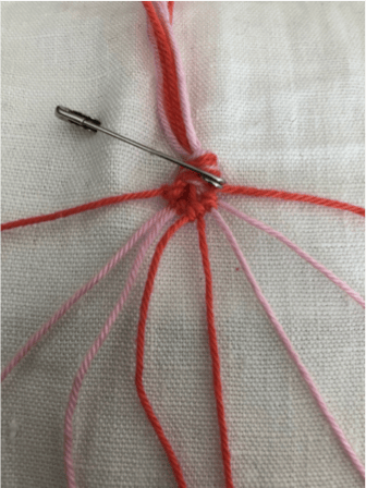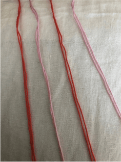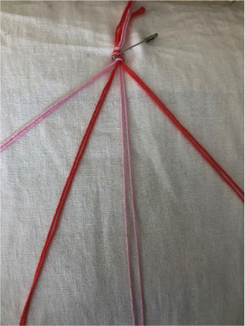 Schneide von jeder Garnfarbe 4 ca. 80cm lange Stränge ab und sortiere sie wie auf dem Bild.