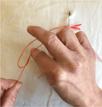 Nun hältst du mit der linken Hand den zweiten Faden fest.